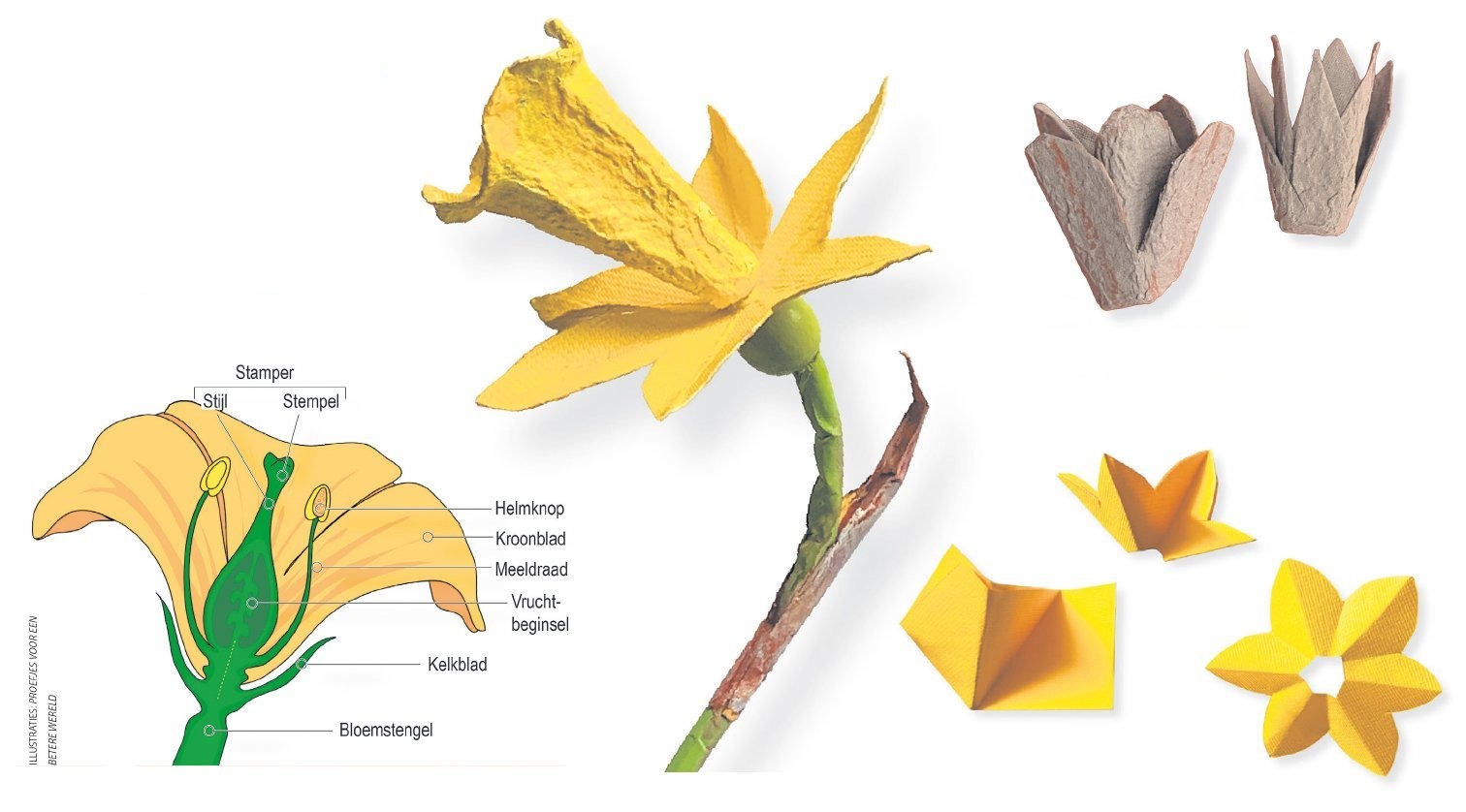 Proefje voor in de brugklas: geef leerlingen eierdozen, rietjes, papier, kralen, lijm en verf en laat ze zo goed mogelijk een tulp of narcis nabootsen.