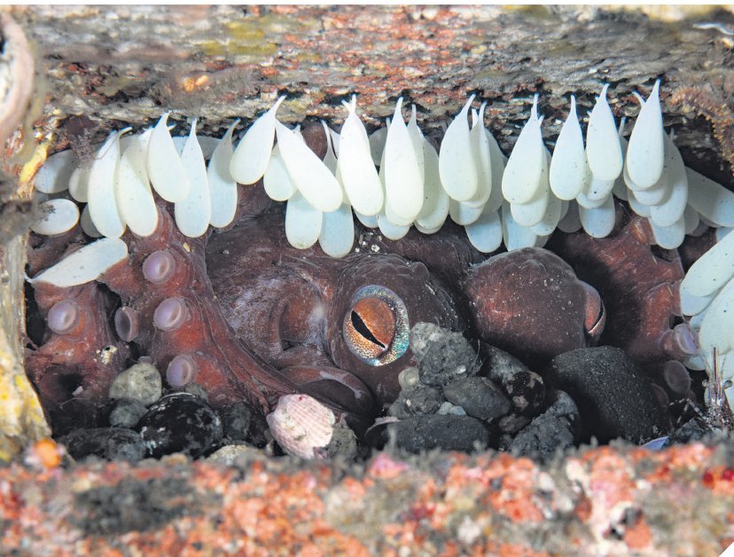 Een broednest van de tweevlekoctopus: het geslacht van de nakomelingen die uit de eikapsels (wit) tevoorschijn komen, hangt af van het aantal geslachtschromosomen. Foto: ImageSelect