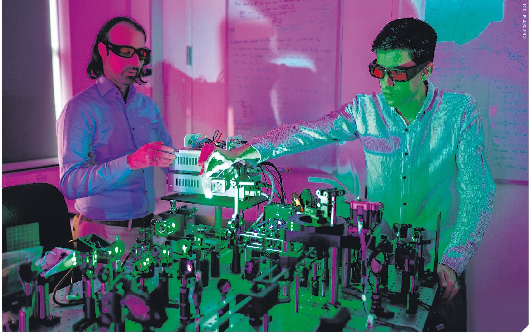 Riccardo Levato en Sammy Florczak (PhD-student in zijn team) werken aan de volumetrische printer. Foto: I. Pel, UMC Utrecht