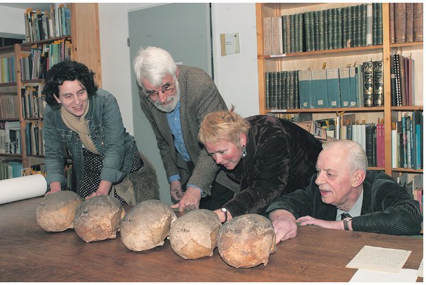 Urker delegatie bekijkt in 2007 de schedels in het Universiteitsmuseum Utrecht. Foto: Comité Urker Schedels