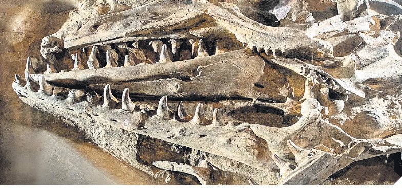 Het type-exemplaar van Mosasaurus hoffmanni ligt nu verweesd in Muséum National d’Histoire Naturelle van Parijs. Het fossiel met twee spectaculaire kaken (foto) komt uit het kalksteen van de Sint-Pietersberg bij Maastricht. Na de vondst in 1778 belandde het in het naturaliënkabinet van het Sint-Servaaskapittel. Men dacht dat het een krokodil betrof. Het werd zo’n iconisch fossiel, omdat veel beroemde geleerden speculeerden over de status van het uitgestorven dier: zo zag de Groninger zoöloog Petrus Camper er een tandwalvis in, maar herkende de Franse anatoom George Cuvier het als (hagedisachtig zee)reptiel. Dat Cuvier het beroemde fossiel kon bestuderen, komt doordat Franse troepen het in 1794 als oorlogsbuit en trofee meenamen uit Maastricht. Het is tot Frans nationaal erfgoed verklaard en in 2009 mocht het Grand Animal de Maestricht – alleen onder strikte terugkeergaranties – in een tijdelijke expositie even terugkeren in zijn vindplaats. Eind 2023 stuurde de gemeente Maastricht, via het Nederlands kabinet, de Fransen een officieel verzoek om teruggave. Het bleef lang stil, maar afgelopen februari meldde wethouder Bastiaens dat het fossiel in 2026 in ‘lange bruikleen’ in Natuurhistorisch Museum Maastricht zal neerstrijken. De maashagedis krijgt daar gezelschap van zijn verwanten Bèr, Lars, George, Pieter en Sjors: maar voor hoelang?