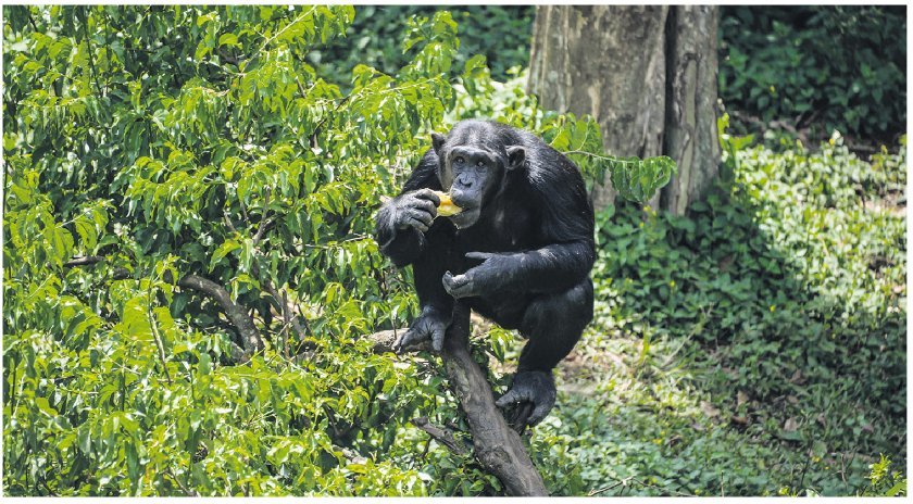 Een chimpansee in het Ngamba Island Chimpanzee Sanctuary in Oeganda, een toevluchtsoord voor mensapen die zijn gered uit de illegale bushmeathandel. Foto: ImageSelect.