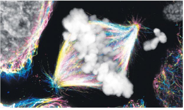 Humane eierstokcel in metafase, met chromosomen in grijs en microtubili in verschillende kleuren. Foto: Kruno Vukušić, Ruđer Bošković Institute
