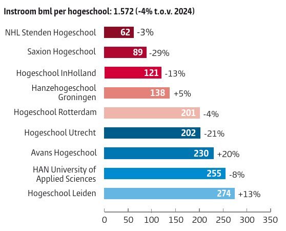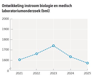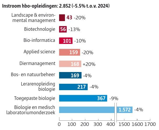 De landelijk grootste biologische hbo-opleiding bml kent regionaal een wisselend beeld, van de eerdergenoemde stijging met 20 procent bij Avans Hogeschool in Breda tot een daling met 29 procent bij Saxion Hogeschool in Enschede en Deventer. Daar stromen dit jaar tezamen 36 minder eerstejaars in dan de 125 van 2024. Teamleider bml Robert Brink van Saxion meldt ‘verrast te zijn door de grote daling’ en heeft hiervoor ‘geen duidelijke verklaring’. Ook de opleidingen biotechnologie en bio-informatie vertonen regionaal een grote variatie aan instroom. In Amsterdam (InHolland) stijgt het aantal eerstejaars biotechnolgie met 13 procent, terwijl in Leeuwarden (Van Hall Larenstein/NHL Stenden) juist 36 procent minder studenten beginnen. Bij bio-informatica scoren Hanzehogeschool Groningen (min 41 procent) en Hogeschool Arnhem Nijmegen (min 33 procent) een sterke daling, terwijl Hogeschool Leiden – na de dip van vorig jaar – weer een stijging van 21 procent doormaakt, van 52 naar 63 eerstejaars. Volgens opleidingsmanager Nicole Almering mede te danken aan de investering in voorlichting op vo- en mbo-scholen. ‘We hebben een nieuwe website met veel informatie en filmpjes van studenten, die meer wordt bezocht dan voorheen’, aldus Almering. Ook is in samenwerking geintensiveerd met mboRijnland en het Middelbaar Laboratorium Onderwijs om de ‘instroom, aansluiting en zichtbaarheid vanuit het mbo te vergroten’.