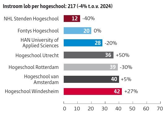 Vrijwel geen enkele respondent meldt een verklaring voor de hoge terugval. Misschien profiteert de bml-opleiding van Avans Hogeschool in Breda, die een opmerkelijke instroomstijging van bijna 20 procent doormaakt, van de tweede plaats als ‘best beoordeelde grote hogeschool’ in de Keuzegids hbo 2025 . Dat is echter niet de reden die medisch bioloog en opleidingscoördinator Robert Sijbrandi noemt. ‘Het verschil zit hem er vooral in dat we vorig jaar tijdens de eerste vier weken al best veel uitval hadden, maar dit jaar veel minder’, aldus Sijbrandi. ‘Een reden voor het verschil in uitval die eerste maand hebben we niet, het lijkt toeval.’ Dat een hoge score in de keuzegids niet garant staat voor een hogere instroom, blijkt wel bij Zuyd Hogeschool in Heerlen/Geleen die in de keuzegidsen van 2025 én 2026 als beste hogeschool uit de bus kwam. Maar ook daar daalt het aantal eerstejaars applied science met bijna 8 procent, van 65 naar 60 studenten.