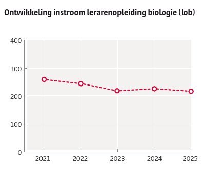 Een sterk wisselend beeld kent ook de tweedegraads lerarenopleiding biologie, die na een lichte opleving in 2024, nu weer een dalende instroom heeft van 4 procent: van 226 naar 217 eerstejaars. Hierbij kent Hogeschool Utrecht de grootste opleving, plus 50 procent, terwijl bij NHL Stenden Hogeschool nu maar twaalf eerstejaars met de lerarenopleiding biologie beginnen: min 40 procent. In de categorie nieuwe opleidingen valt nog te melden dat bij HAS Green Academy in Den Bosch zich 83 studenten inschreven bij de kersverse tweejarige hbo-opleiding associated degree (AD) ecologie. Ook Hogeschool Rotterdam (HR) meldt dat zich voor het eerst twee studenten hebben aangemeld voor de AD-lerarenopleiding biologie. ‘Een opleiding van twee jaar die je opleidt tot docent derdegraads’, meldt de HR-vakgroepcoördinator biologie Tom Ansen. ‘Je mag dan zelfstandig voor de klas staan maar ontwikkelt geen lessen/toetsen en bent niet eindverantwoordelijk over het curriculum.’
