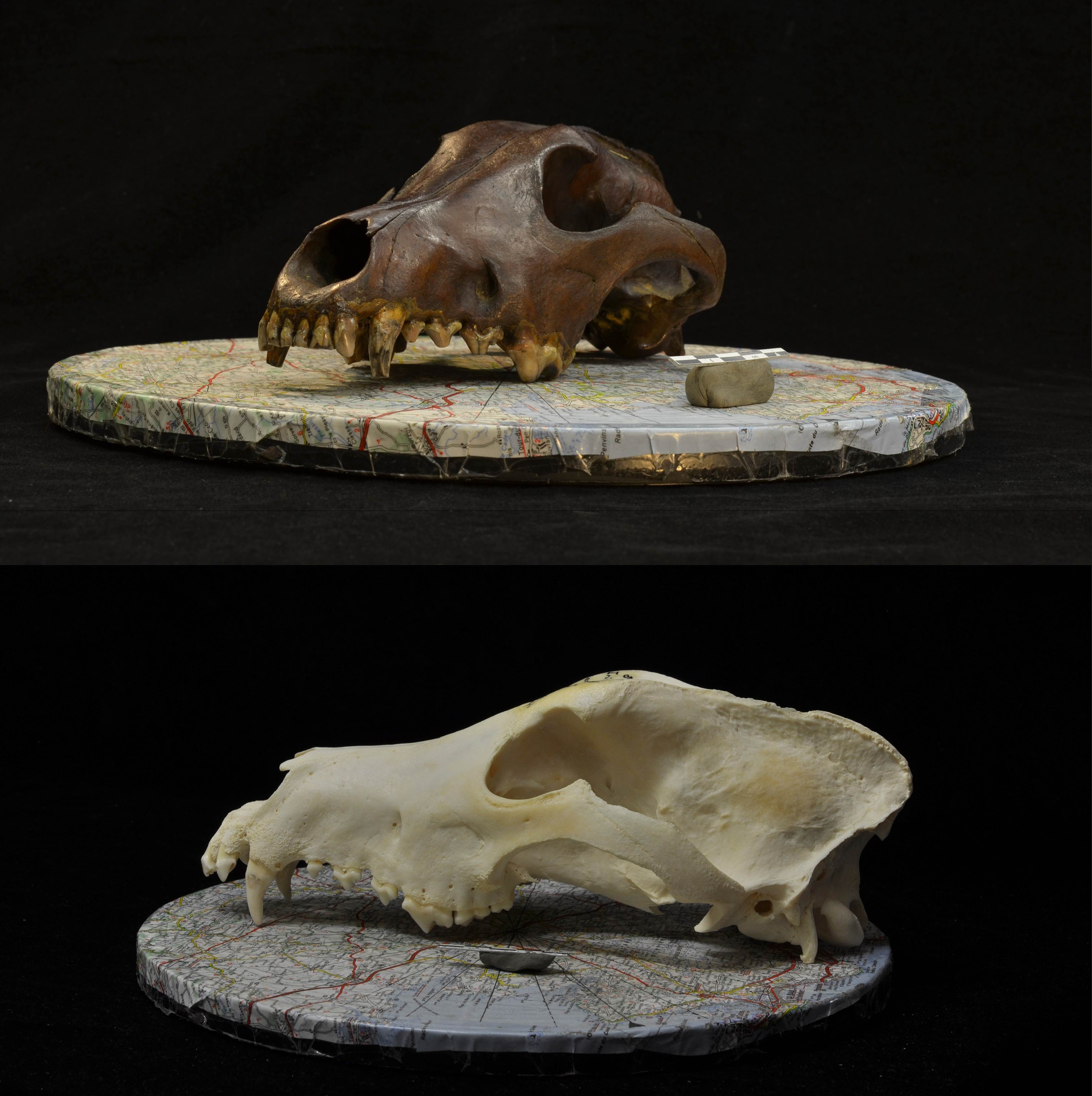 Een archeologische (boven) en moderne (onder) hondenschedel, die zijn gebruikt in het fotogrammetrische onderzoek. Foto: Carly Ameen (University of Exeter).