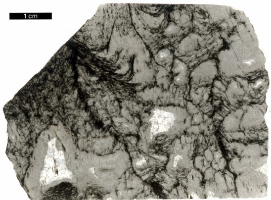 De zwarte structuren in deze 2,5 miljard jaar oude dunne slijpplaat zijn microbieel van oorsprong en mogelijk door fotosynthetiserende microben geproduceerd. Foto: Andrea Corpolongo.